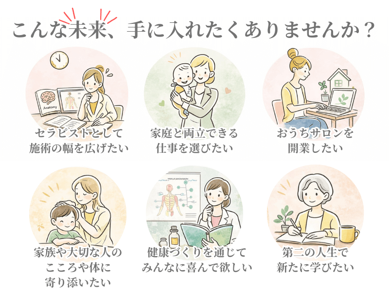 美容、健康、家族や身近な人のため、開業のため。時間をかけたい人、短期間で学びたい人。出来るだけお金をかけずに学びたい人。