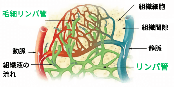 リンパ管の中を流れているのがリンパ液です。リンパ液は血漿の成分ですので、黄色っぽい透明の液体です。組織細胞から出た老廃物や静脈で吸収しきれなかった水分などが含まれます。